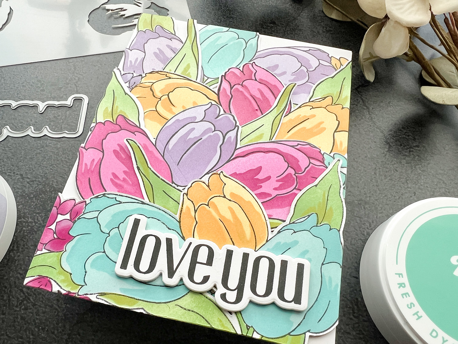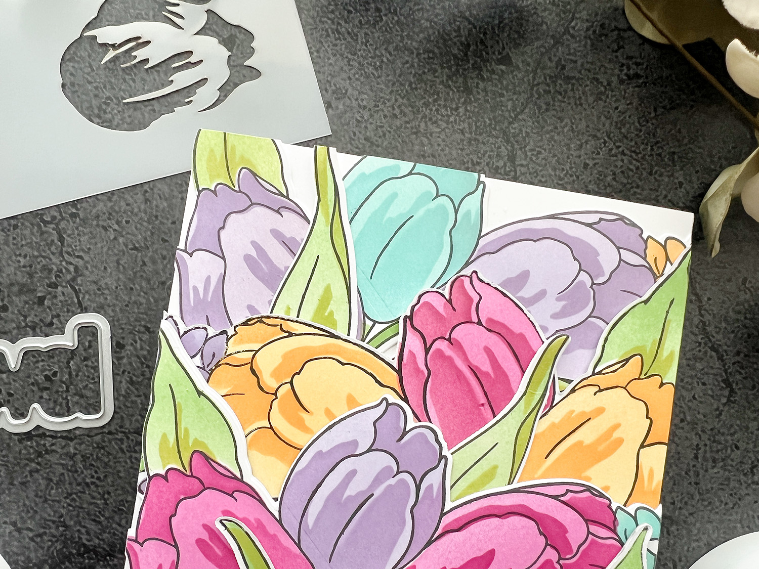 I then used the stencils, my favorite Fresh Die Inks and inked up the flowers. For the mirrored images you need to turn your stencil over. I then used the add-on die to cut out the tulips. To cut out the mirrored tulips was a bit tricky but a lamp behind your image definitely helps to align the die with the outline of the image.