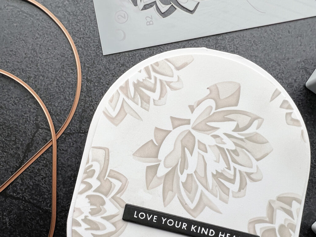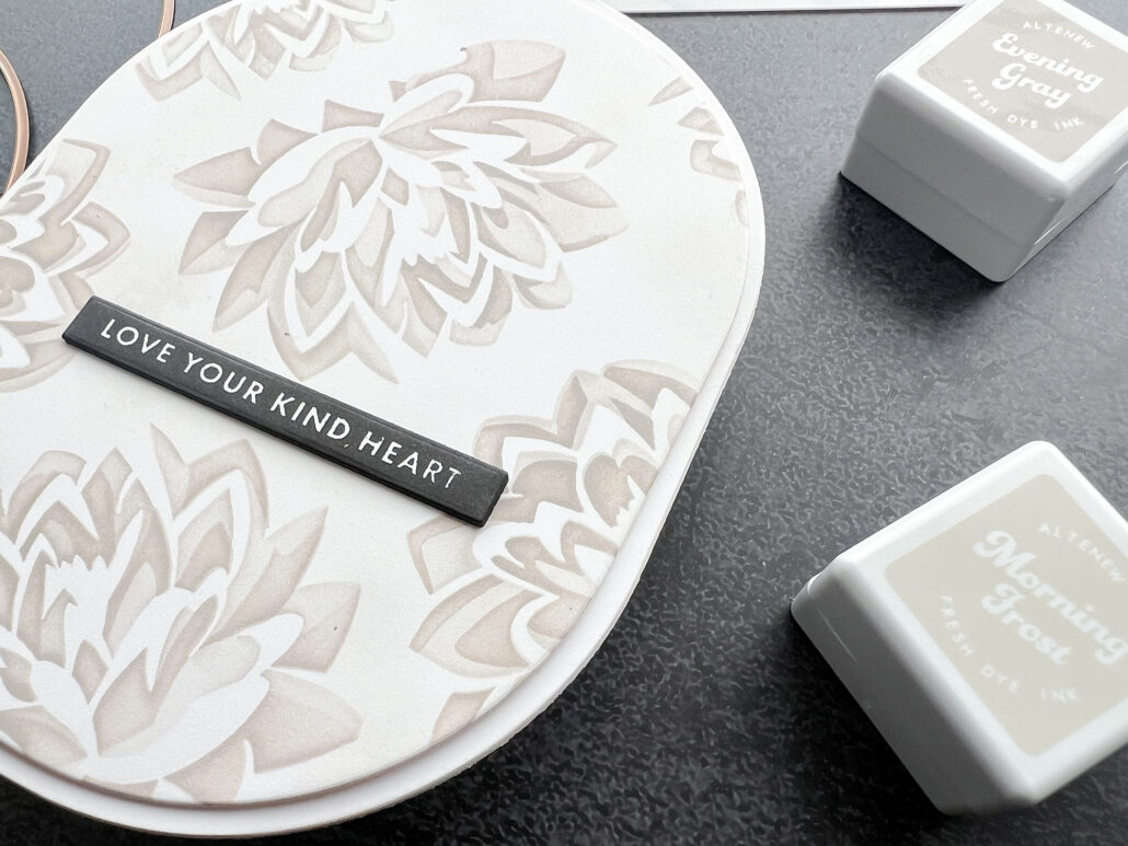 First off, I used the stencils from the Modern Dahlia set with Morning Frost and Evening Gray from the Warm Gray Fresh Dye Ink Mini Cube Set and scattered the flowers on my background. For the sentiment I used a stamp from the Craft Your Life Project Kit: Chocolate Flowers and stamped it with Obsidian Pigment Ink. For a little bit of dimension I stacked the sentiment three times.