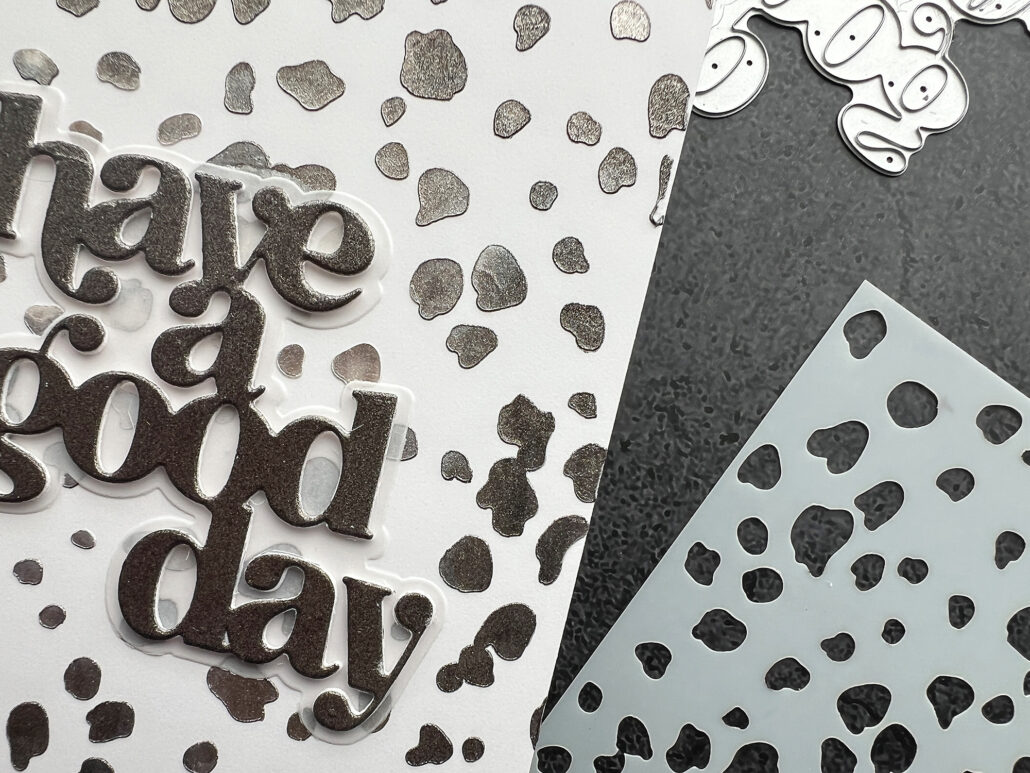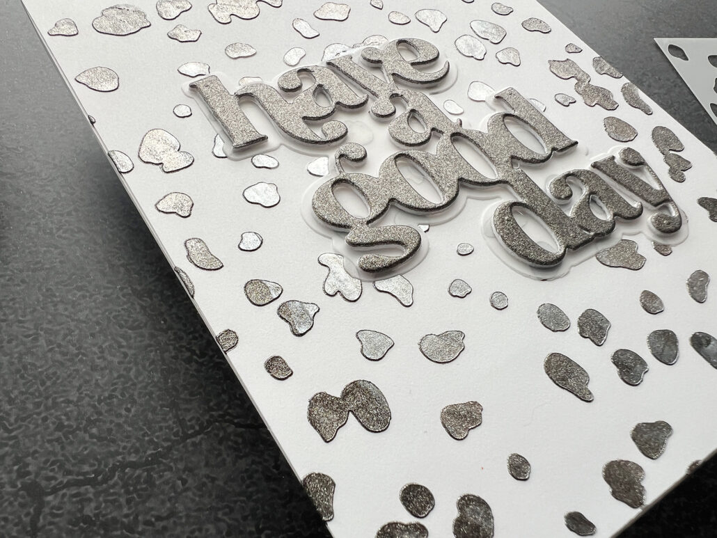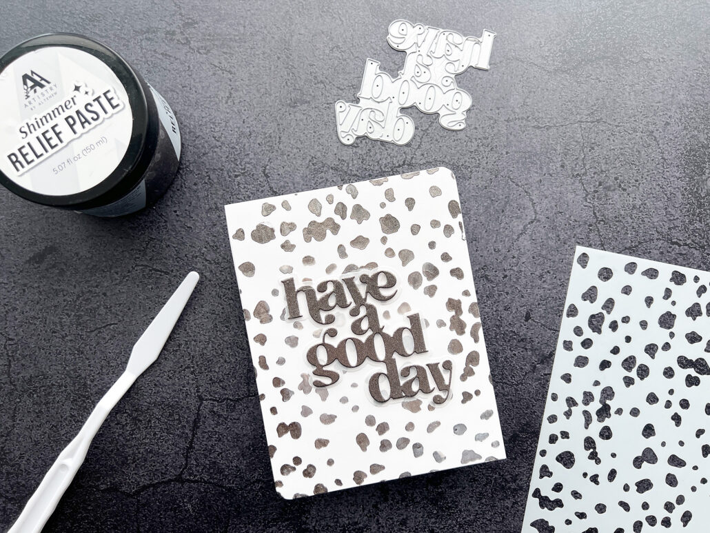 I started with the darkest color on the outside (Smoky Quartz) and used the lightest color (Pearl) on the inside, so that I would create a focal point for my sentiment. I also added a thin layer of Smoky Quartz on cardstock and let it dry over night. Then I used the have a good day die from the Timeless Sentiments 2 and cut out the dried layer of the paste. I stacked two more layers of cardstock and added a piece of vellum from the shadow die.