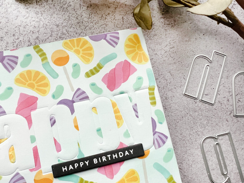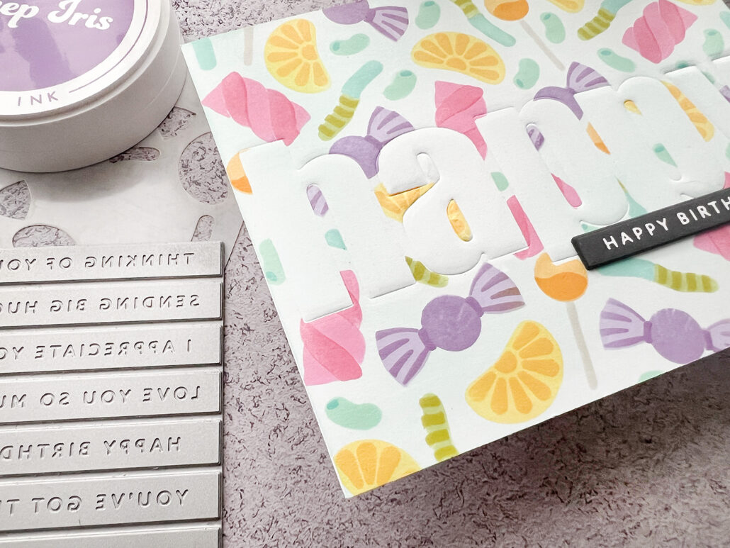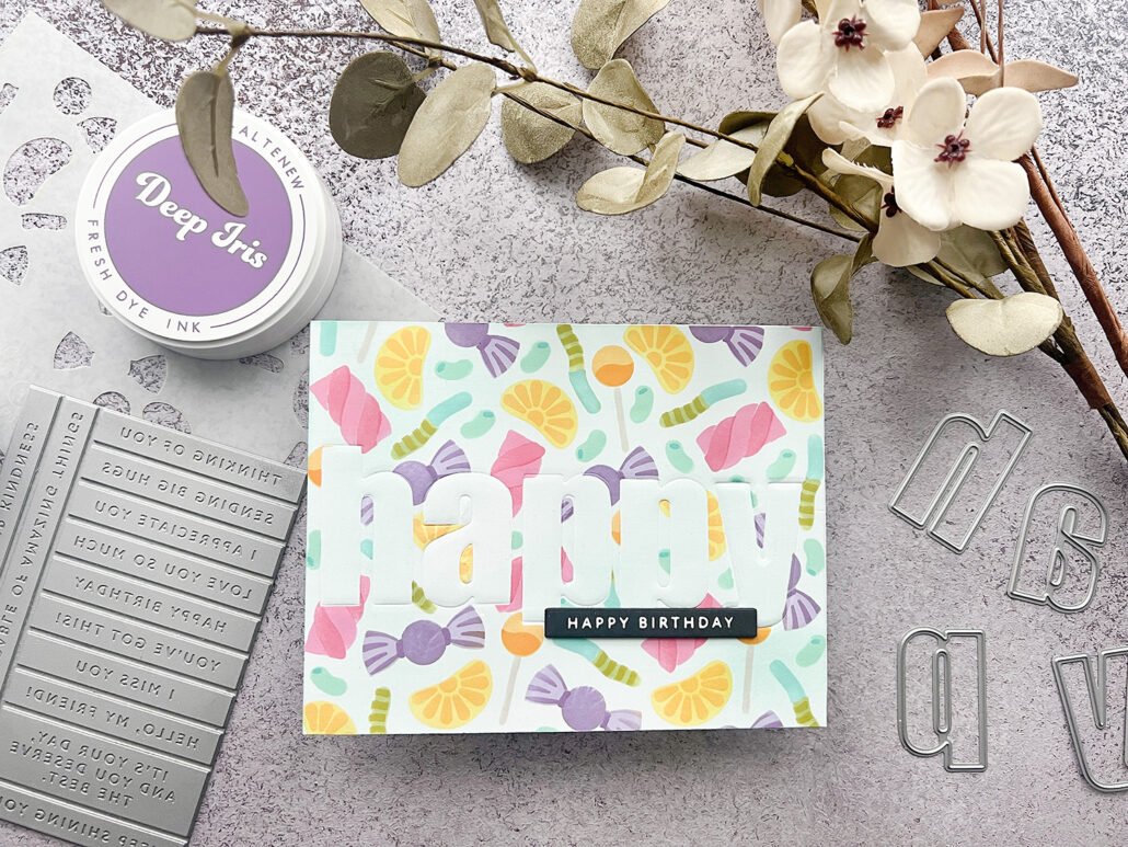 I first masked the word happy with the Bold Alphabet dies and then started ink blending using the Sugar Rush stencils. i used a whole bunch of different inks and they are all listed below for your reference. When I took off the masking paper the word happy was almost invisible. So I had to find a way to make it visible.